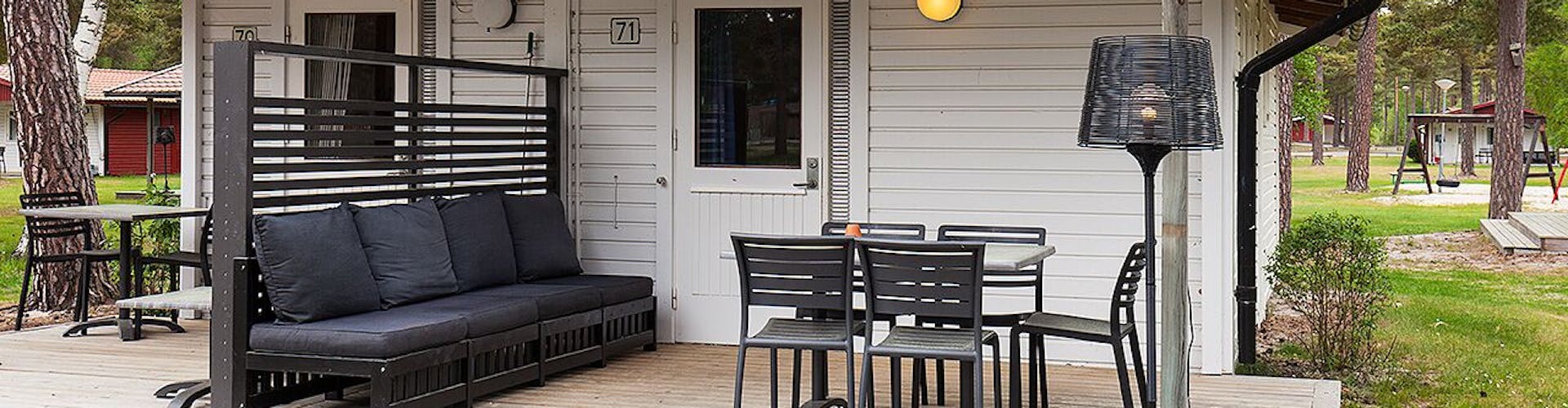 Stugtyp 12 erbjuder ett bekvämt boende med två våningssängar med bred underslaf samt en bäddbar soffa i allrummet, vilket ger gott om plats för en avkopplande vistelse. Här finns ett pentry med köksutrustning, mikro, kylskåp med frysfack och kaffebryggare för alla bekvämligheter ni behöver. Stugan har även dusch, WC och TV för extra komfort. Alla stugor har en möblerad altan där ni kan njuta av soliga dagar och fina kvällar.